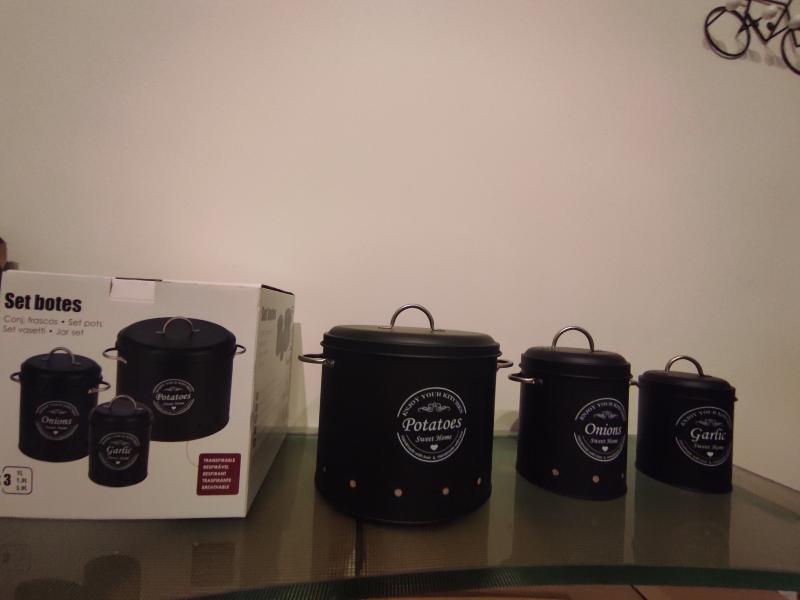 Lote de 3 sets de botes para patatas, cebollas y ajos. Cada set contiene 3 botes con sus respectivas tapas.Precio del lote 35.00€Emabalaje original, sin usoGastos de envío no incluidosSe puede pagar con bizum o transferenciaEtiquetas: