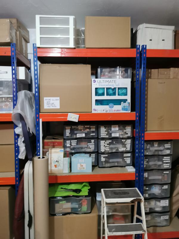 Liquidación por cierre de negocio de restos de stock de repostería, cocina, decoración mesas dulces. El lote incluye moldes para hornear, para moldear o para hacer galletas, libros de repostería, cápsulas para cupcakes, cortadores de galletas, cajas para tartas, bolsitas de uso alimentario, stands para pasteles y postres, delantales, bases, bandejas cartón...utensilios varios como espátulas, mangas pasteleras, boquillas, pinceles, rodillos. También incluye productos varios para decoración de mesas dulces y fiestas como guirnaldas, pizarritas, washi tapes, tazas, jarras...