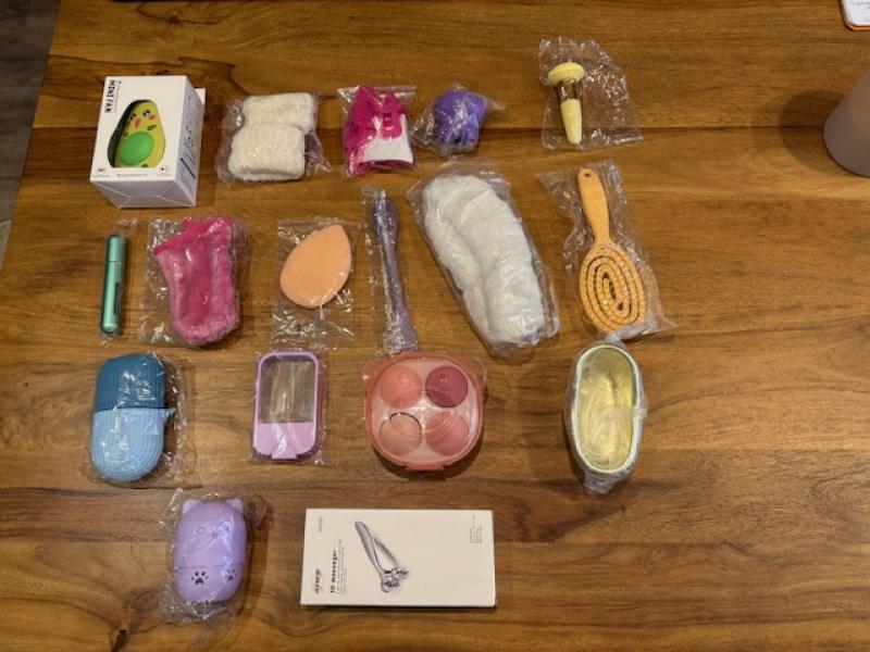 Todos los productos son nuevos y con precinto individual. Son 17 productos diferentes en varios colores:cepillo para pelo, esponja exfoliante, dosificador de perfume, espejo led con ventilador, guante desmaquillante, esponjas maquillaje con y sin mango, molde de hielo, soportes para guardar gadgets, cinta para pelo y muñequeras para desmaquillarse, masajeador facial, cepillo desmaquillante y molde para las uñas.