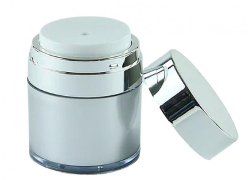04/03/2024 Tarro o frasco de crema AIRLESS rellenable plateado de gran calidad con capacidad de 50 ml. Con bomba de vacío, ideal para viaje.
