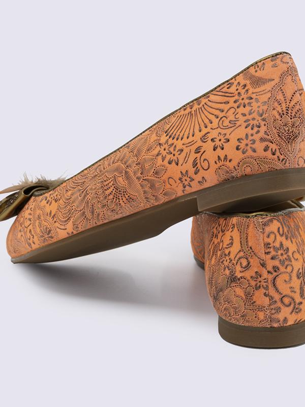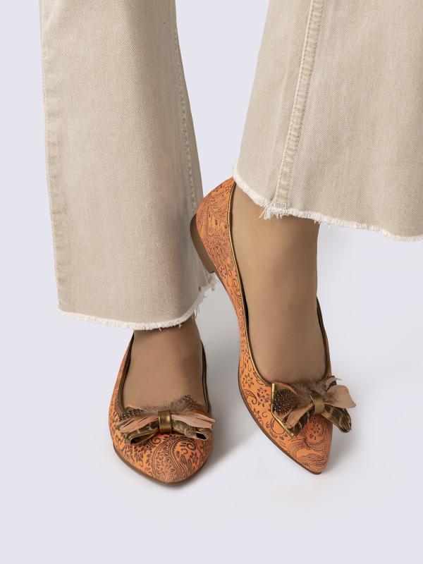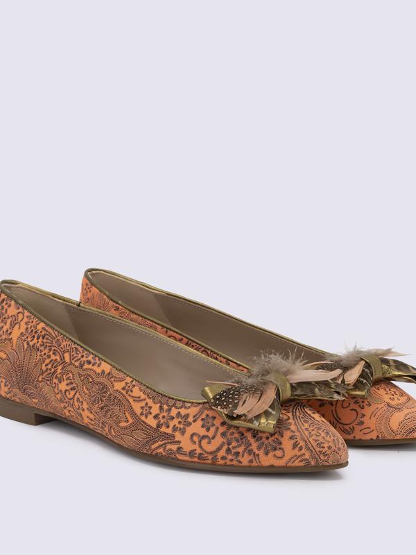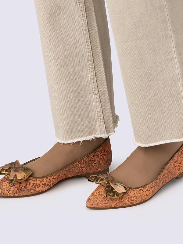 Zapatos de mujer tipo bailarinas o manoletinas, horma ancha. Fabricados a mano en Elda, Alicante. Hechos con cueros premium. Lazo de plumas naturales.