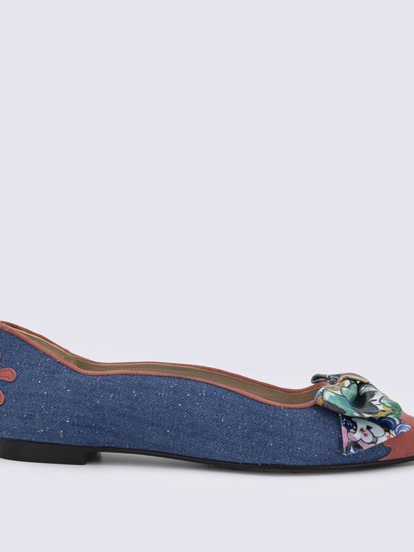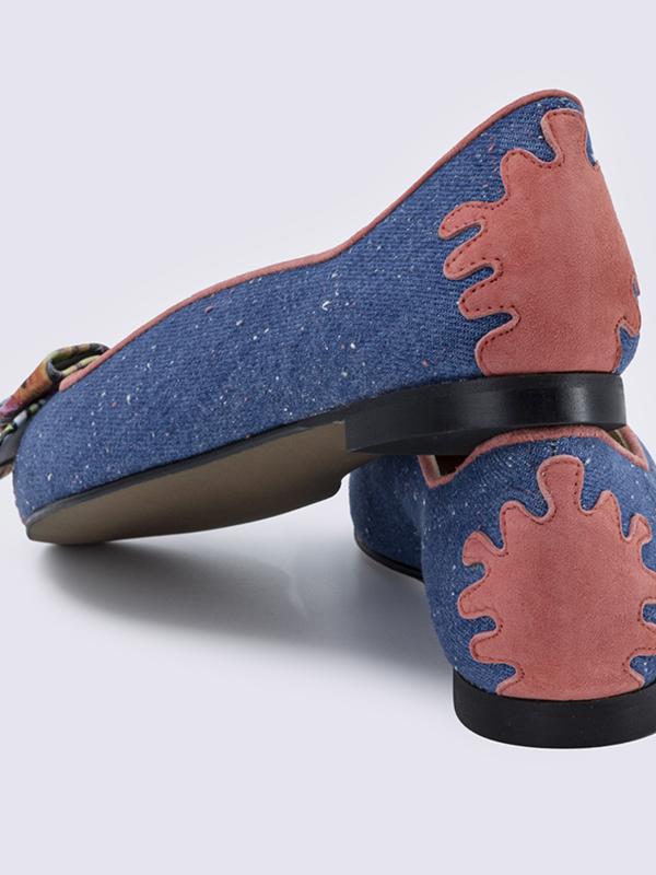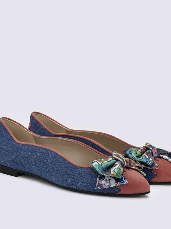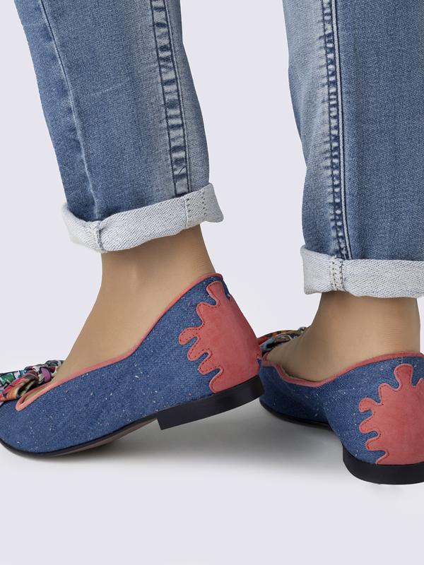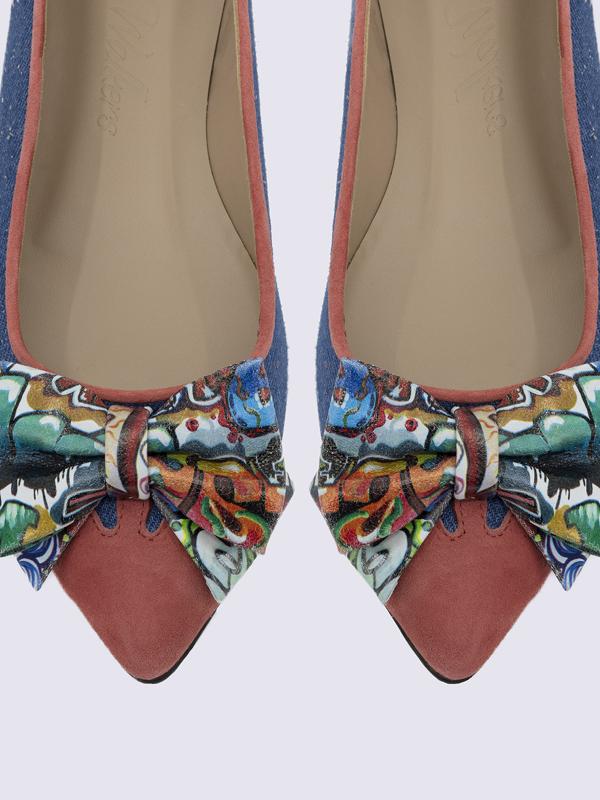 Zapatos de mujer tipo bailarinas o manoletinas, horma ancha. Fabricados a mano en Elda, Alicante. Hechos con cueros premium. Lazo de cuero con print de graffiti