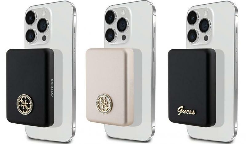 Collection 4G Strassed Metal Logo MagSafe Type Wireless Power Bank Material Aluminium/Silicone Capacity 5000 mAh / 3.85V / 19.25Wh Dimensions 83x60x14 mm Wireless charging power 5W / 7.5W / 10W / 15W (Max) USB-C input 5V?3A, 9V?2A USB-C output 5V?3A, 9V?2.22A, 12V?1.66A Power USB-C Color Black Included 1x Powerbank Guess Strassed Metal Logo MagSafe