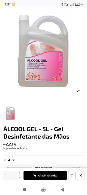 Lote en liquidación 6.912 garrafas Gel desinfectante para manos en garrafas de 5 litros. Apto en la limpieza de materiales que pueden ser tratados con disoluciones hidro-alcohólicas. 70 % de alcohol. Marca Glow. Fabricado en Portugal. Cada palet lleva 144 garrafas de 5 litros en cajas de 3. Precio en tienda 42 euros garrafa. Nuestro precio 0,85 euros garrafa. Venta minimo 1 palet, Precio para todo 0,79 euros. Stock total 48 palets. Disponible para ver, pagar y cargar en nuestro almacen en Alicante.Teléfono y Whatsapp: +34 657636111Web: WWW.LIQUISTOCKS.COMEtiquetas: