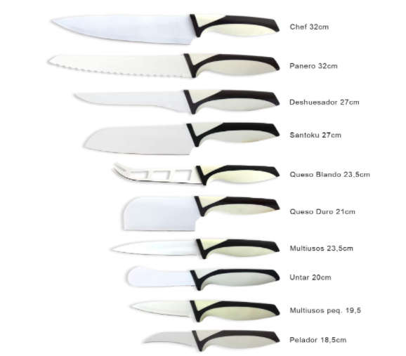 · JUEGO 10 CUCHILLOS CERÁMICOS: (1) Chef, (2) Panadero, (3) Deshuesador, (4) Santoku, (5) Queso Blando y (6) Duro, (7) Multiusos, (8) Para Untar, (9) Multiusos Pequeño y (10) Pelador
