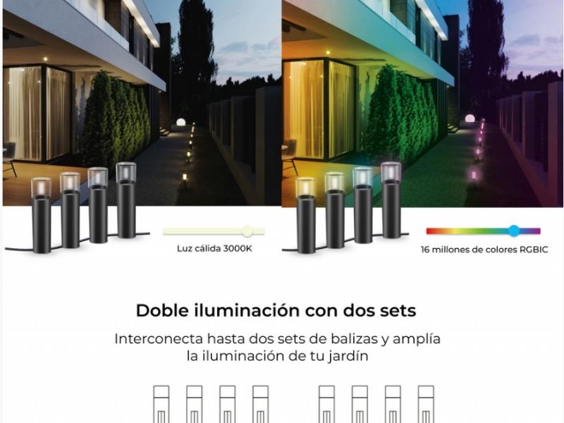 Sus 200 lúmenes, sus 12W de potencia y la tecnología RGBWIC de estas balizas te permitirán jugar con los millones de posibilidades de colores RGB y sus intensidades de la manera que tú prefieras. Sincroniza varios colores a la vez o escoge luz blanca de 3000K y consigue ambientes únicos para tu jardín. ¡Tú eliges como iluminarlo!