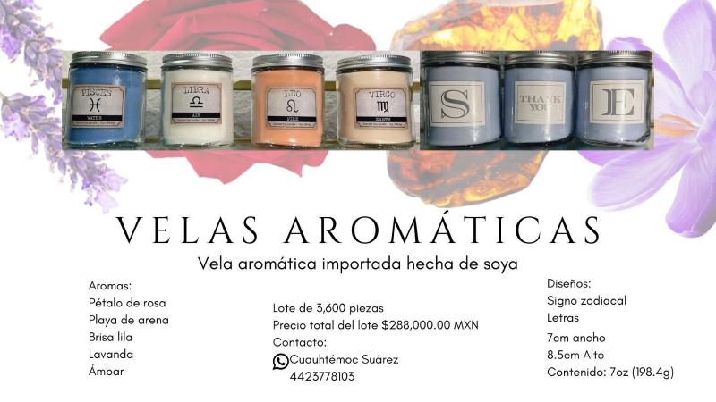 04/05/2023 Aromas:Pétalo de rosaPlaya de arenaBrisa lilaLavandaÁmbarDiseños:Signo zodiacalLetras7cm ancho8.5cm AltoContenido: 7oz (198.4g)Lote de 3,600 piezasPrecio total del lote $288,000.00 MXNContacto:Cuauhtémoc Suárez4423778103Etiquetas: