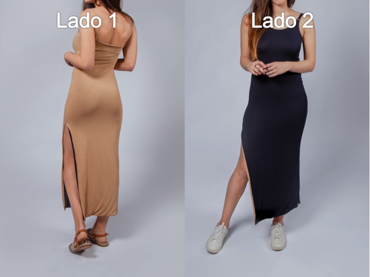 Vestido Reversible - Doble Cara Vestido largo básico ajustado sin perder la sensación de comodidad y manteniendo la elegancia. Puedes transformar los vestidos largos en Faldas largas, obteniendo de esta manera cuatro prendas en una.