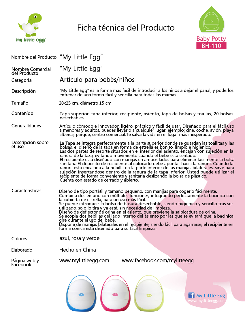 28/07/2020 Diseño de tipo portátil y tamaño pequeño, con manijas para cogerlo fácilmente.Combina dos en uno con múltiples funciones, integrando perfectamente la bacinica conla cubierta de estrella, para un uso más fácil.Se puede introducir la bolsa de basura desechable, siendo higiénico y sencillo tras serutilizado, solo lo tira y ya está, sin necesidad de limpieza.Diseño de deflector de orina en el asiento, que previene la salpicadura de orina.Se acopla dos hebillas del lado interno del asiento por las que se evitará que la bacinicagire durante el uso del bebé.Dispone de manijas bilaterales en el recipiente, siendo fácil para agarrarse; el recipiente enforma cónica está diseñado para su fácil limpieza.Documentación adjunta: