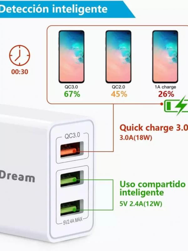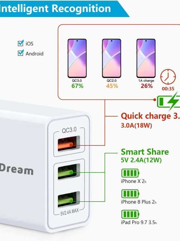 - Carga multipuerto: 3 puertos USB (1 QC 3.0 18 W + 2 puertos compartidos 5 V2.4 A 12 W) hasta una salida máxima de 30 W, carga 3 dispositivos al mismo tiempo con toda velocidad. IC inteligente integrado puede detectar automáticamente todos los dispositivos conectados y proporciona la salida de carga óptima.