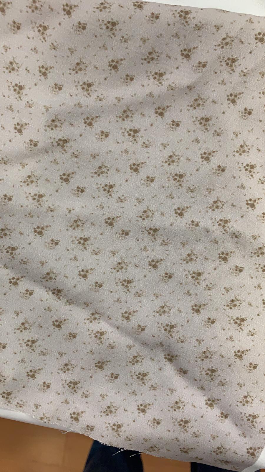 Tela fresca y delgada, con estampado de flores. Ideal para hacer vestidos y tops. De color blanco con color teja. Son 132 metro de tela. 95%poliester 5% elastomero.
