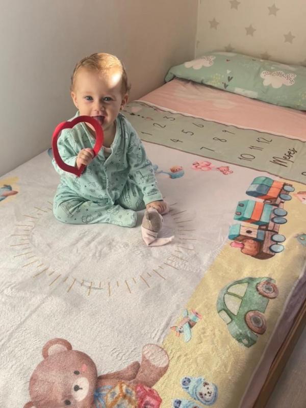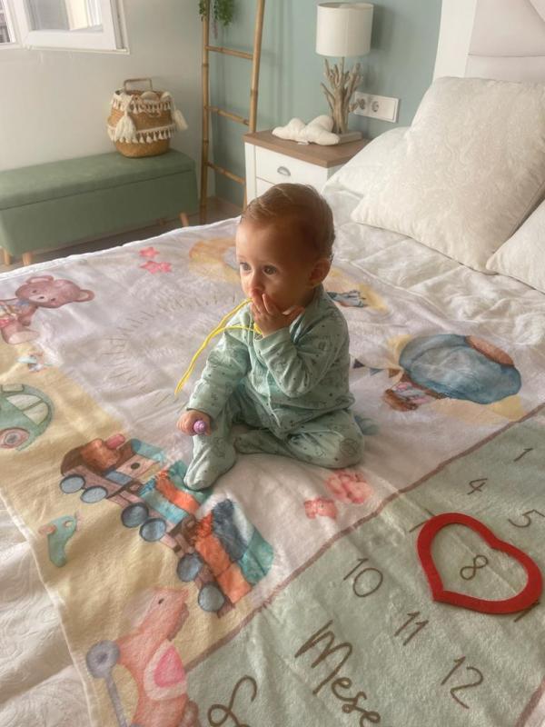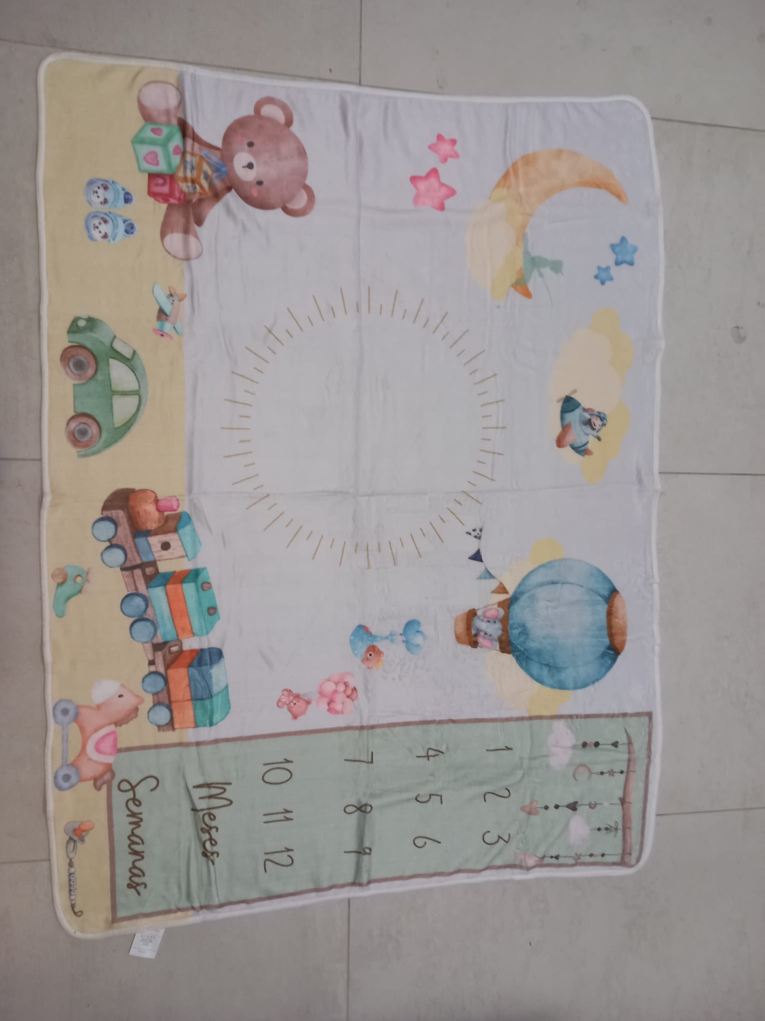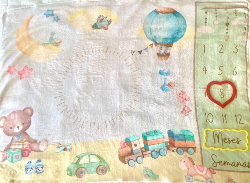 Mantas de 100% franela extra suaves para cumplemeses de bebes, tamaño 130cmx 100cm, incluyen marquitos textiles para indicar el tiempo del bebe y poder hacer un seguimiento de su crecimiento. El dibujo es unisex. Se liquidan 300 unidades a 4€ la unidad, se pueden enviar en cajas de 50 unidades