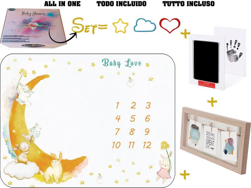 01/04/2022 PEDIDO MINIMO 100 UNIDADES, CANTIDAD MÁXIMA DISPONIBLE POR LIQUIDACIÓN 350 UNIDADES. PRECIO POR UNIDAD 10 euros- SE PUEDE ENVIAR MUESTRA (30€ LA MUESTRA), EL PRECIO DE LA MUESTRA SE DESCUENTA AL REALIZAR EL PEDIDO.¿QUÉ TRAE LA CAJA?: 1 Manta de hitos de 90cmx90cm Franela 330 g/m2 que trae 3 accesorios con forma de Nube, Estrella y Corazón para colocar en los números correspondientes a cada mes + 1 Marco de recuerdos ideal para 1º foto, ecografía, pulsera de hospital, etc + kit para obtener huella mano o pie compuesto por 1 placa de tinta sin contacto con el bebé y una tarjeta para la toma de la impresión.Documentación adjunta: